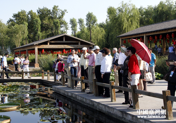 24日,江丙坤和夫人,以及參加活動的臺灣嘉賓在鐵嶺市委書記吳野松的陪同下,參觀了鐵嶺蓮花湖濕地森林公園。(中國臺灣網 普燕 攝)