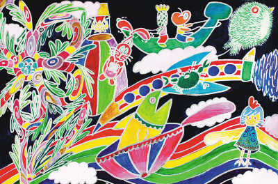這個奇怪的天堂里有飛翔的兔子,也有準備出航的水果們,還有躲在雨傘里的魚……皓茵小朋友,你是怎么想的?