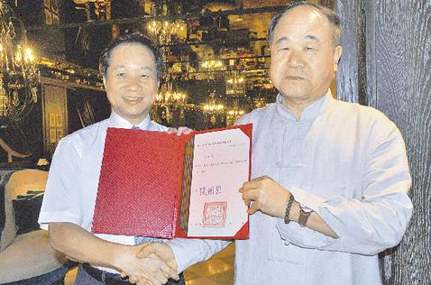 臺師大校長張國恩(左)正式將聘書交給莫言,邀請他擔(dān)任講座教授。(圖片由臺師大提供)