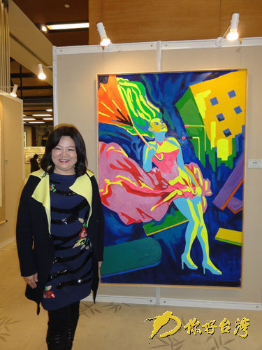 臺(tái)灣油畫(huà)家吳和珍與她的作品。(你好臺(tái)灣網(wǎng) 圖)