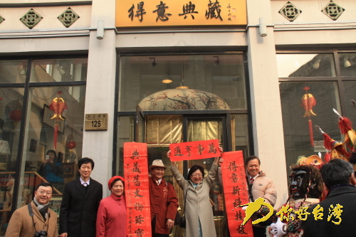 “得意典藏”商戶在自家門前張貼由兩岸書法家共同創作的春聯作品(你好臺灣網 陳靜 攝)