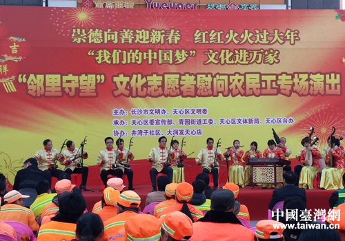 中國臺灣網1月24日長沙消息 1月22日下午,由長沙市文明辦、天心區文明委牽頭主辦,天心區臺辦與區直相關單位和街道共同承辦,臺企大潤發超市天心店負責協辦的“鄰里守望”文化志愿者慰問農民工專場演出在大潤發超市前坪火熱上演。來自天心區群眾文藝團隊的文化志愿者們現場為市政、園林、建筑、環衛等行業500多名農民工奉獻了一場冬日里的“文化盛宴”。