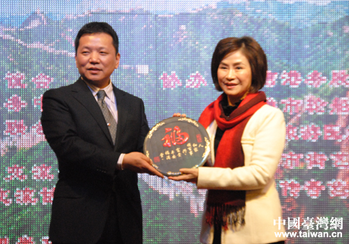 北京市臺(tái)聯(lián)副會(huì)長潘新洋與高雄河邊餐飲集團(tuán)董事長張素鑾互贈(zèng)禮品。(北京通訊員 郭寧 攝)