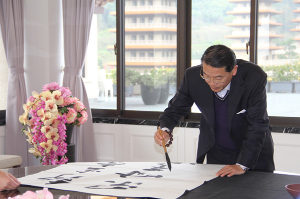 程茂全將現(xiàn)場創(chuàng)作的書法作品贈送給佛光山佛陀紀(jì)念館。(中國臺灣網(wǎng) 李婷婷 攝)