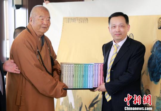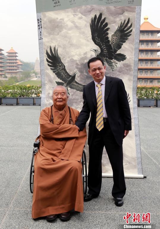 東盟-中國書畫家協(xié)會榮譽(yù)主席、大陸著名書畫家君壽12日來到高雄佛光山佛陀紀(jì)念館,拜會佛光山開山宗長星云大師,并將其歷時(shí)一年所完成長六米、寬一點(diǎn)五米的巨幅畫作《佛光普照金色荷塘》圖,贈(zèng)予大師。星云則以《百年佛緣》系列叢書回贈(zèng)。