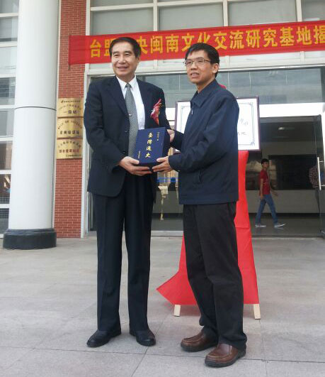 全國政協常委、副秘書長、臺盟中央副主席黃志賢(左)向泉州師范學院贈送叢書《臺灣通史》(記者 林錦旺/攝)