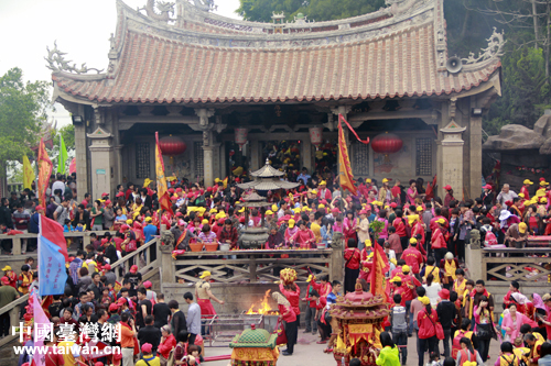 媽祖誕辰愈近,來湄洲媽祖祖廟謁祖的普通進香團、大型進香團劇增,圖為4月20日早上媽祖廟進香人潮。(中國臺灣網 楊麗 攝)