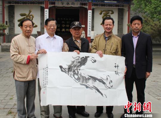 全球中華粥會副會長、天馬花會創(chuàng)會人孫晉卿(左一)創(chuàng)作“天馬”圖贈送給保定軍校紀(jì)念館。