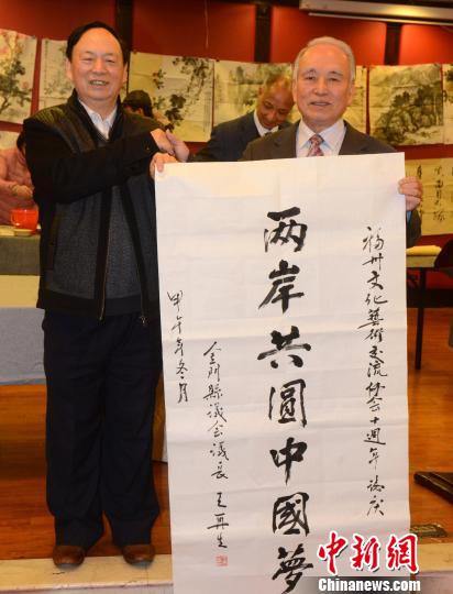 金門縣議會議長王再生(右)向福州文化藝術(shù)交流協(xié)會會長張?zhí)旖痤}贈“兩岸共圓中國夢”書法作品。 劉可耕 攝