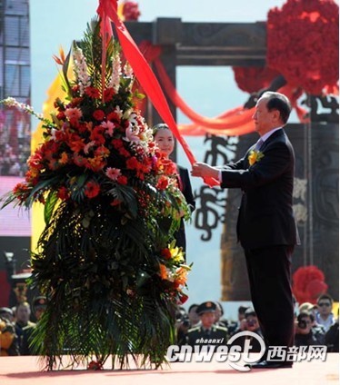郁慕明在壬辰(2012)年清明公祭軒轅黃帝典禮上敬獻花籃。(資料圖片)