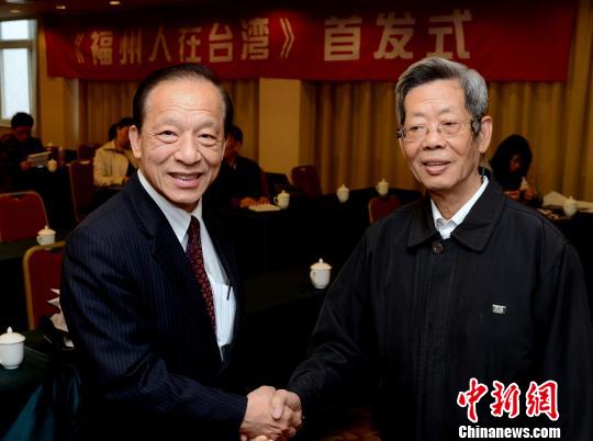 出席《福州人在臺灣》全國發行首發式的該書作者、福州80歲老人鄭宗乾(右)與為該書封面題字的臺灣著名書法家、博士生導師陳維德博士相聚福州。 記者劉可耕 攝