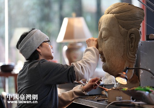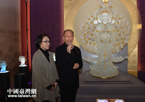 臺灣琉璃藝術家張毅介紹楊惠姍創作兩米高琉璃千手千眼觀音像的過程。(上海臺辦 葛鳳章 攝)
