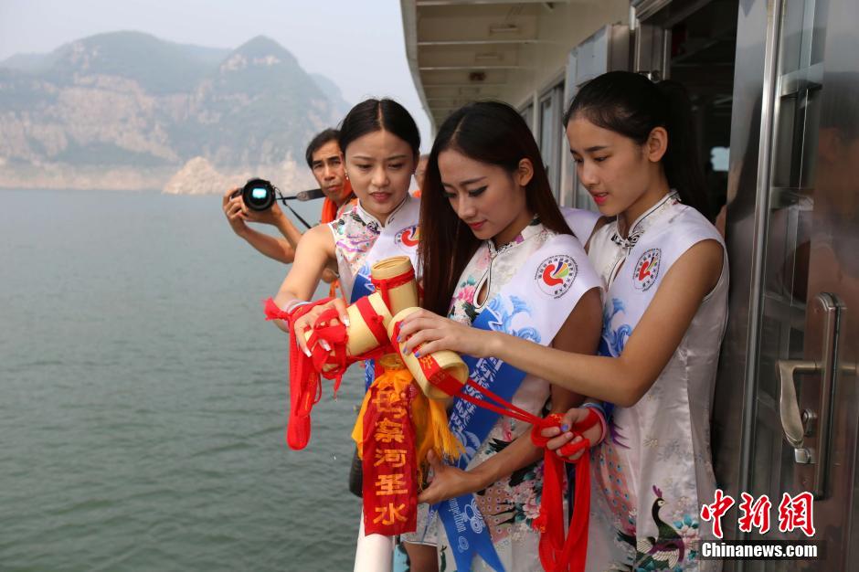 6月22日,河南濟源小浪底黃河三峽,國際旅游海峽兩岸形象大使的代表在母親河采集“圣水”,她們采用徒步、輪船、水上飛機三種形式,在黃河水匯集的三條峽谷孤山峽、龍鳳峽、八里峽采集“圣水”,并在神龍祈福臺上舉行“圣水”祈福儀式,為龍的傳人華夏子孫進行祝福,這些形象大使將帶著母親河“圣水”參加在臺灣舉行的國際旅游海峽兩岸形象大使總決賽,并將母親河“圣水”注入日月潭。黃河是中華民族的母親河,黃河是中華文明的發祥地,多少背井離鄉的游子以能吮吸一口黃河水,捧一把家鄉的泥土而感慨萬千,將母親河“圣水”注入日月潭寓意著海峽兩岸根脈相連、血源相聚的骨肉同胞之情。圖為:在黃河輪船上使用竹筒采集“圣水”。中新社發王中舉 攝