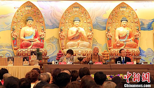 9月21日,臺灣佛光山開山宗長星云大師(中坐者)在臺北發表《星云智慧》,新書收錄他1951年至今最重要的100篇文章。中國國民黨臺灣地區領導人選舉參選人洪秀柱(左一)受邀出席,她推崇星云大師一生推動人間佛教的貢獻。中新社發 劉舒凌 攝