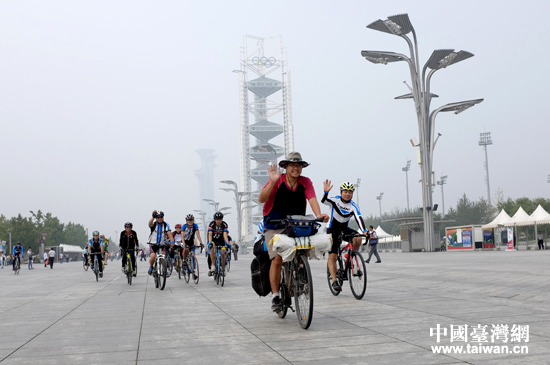 24日下午,臺灣青年騰飛達的“絲綢之路——馬可波羅騎行之旅”在抵達國家體育場后畫上圓滿句號。(中國臺灣網 普燕 攝)