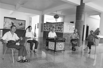 霞峰村的老人們喜歡到純良文化閣吹拉彈唱,享受晚年文化生活的幸福。