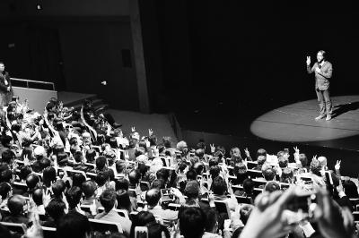 走進繁華熱鬧的美羅城商場,最引人注目的就是隨處可見“上劇場”廣告——“賴聲川的劇場”“上劇場開幕季”……坐著貼滿了“上上上上劇場”招貼的電動滾梯來到商場五樓,會看到巨大的“上劇場”標志;觀眾入口處的墻上,還有一段賴聲川手寫的話:“劇場的絕對魅力/在于他的現場性/它的浪漫在于/它是生命/短暫與無常的縮影——賴聲川”。走進劇場,所有人幾乎都忍不住驚呼一聲,因為真的很難想象在一座喧鬧的商場里,居然會有一個超過20米的挑高、極具空間感、能容納699名觀眾同時看戲的劇場。
