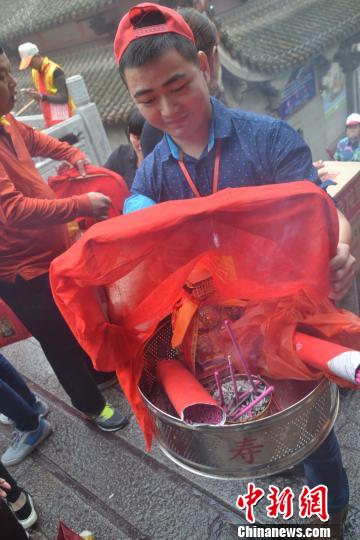 已是第6次來祖廟的臺灣高雄發天宮主委林永元說,該宮媽祖是當年鄭成功驅逐荷蘭殖民者、收復臺灣時帶過去的;早在1990年,發天宮便首次來祖廟尋根謁祖。
