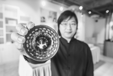趙勝杰展示他專為平潭創作的茶盞,并命名為“黃金流瀑”。蔡起輝 王鳳山 攝