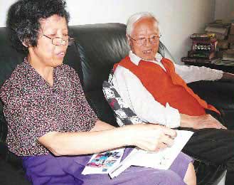 王俊嶸(右)與徐月美(左)夫婦保存著新疆女大學生唐紅寄來的信,看著她的成績單,兩人十分欣慰。臺灣《聯合報》記者翁禎霞攝