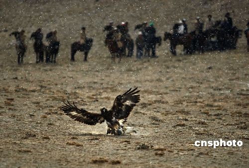 月21日上午,在“中國獵鷹故鄉”新疆阿合奇縣蘇木塔什鄉獵鷹場上,全縣百余名獵鷹人帶著獵鷹為參加“第二屆獵鷹文化節”的游客展示“放飛獵鷹”、“獵鷹捕兔”、“獵鷹活捉狐貍”等民族特色節目。 中新社發 馬衛平 攝