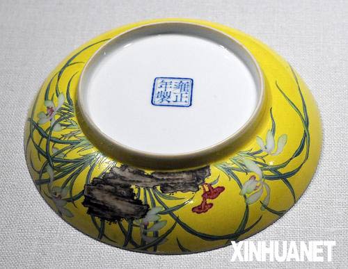 這是10月6日在臺北拍攝的清雍正瓷胎畫琺瑯黃地芝蘭圖盤。新華社發(fā)(吳景騰 攝)