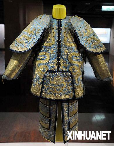 這是10月6日在臺北拍攝的雍正皇帝御用鎧甲“月白緞繡金龍銅釘棉甲”新華社發(fā)(吳景騰 攝)