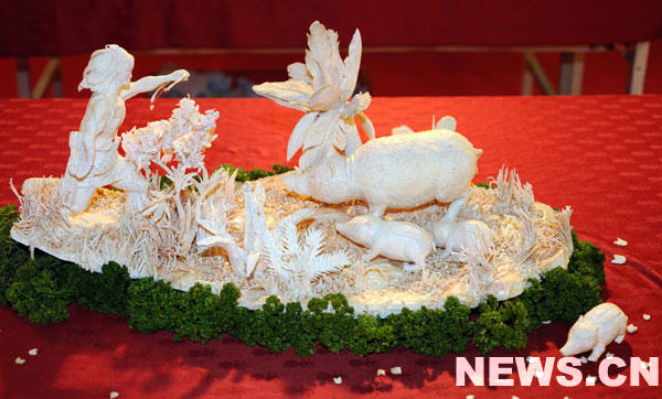 10月10日在臺北廚王爭霸賽上拍攝的用芋頭雕刻的作品。第二屆臺北廚王爭霸賽暨2009臺北國際廚王邀請賽于10月9日至12日在臺北舉行,兩岸廚師的高超廚藝令觀眾大開眼界。新華社發(吳景騰 攝)