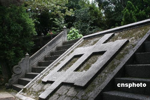 墓前斜坡上,用水泥雕成一個高大的“中”字。取意于閻錫山認為:處事、為人、為政,都要“發于仁,歸于中”。中新社發耿軍攝