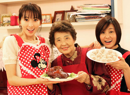 臺灣名模林志玲(左)向知名主持人海芬的奶奶(中)學做年菜。圖為林志玲手捧自己最愛的年菜紅燒蹄膀。(圖為TVBS圖)