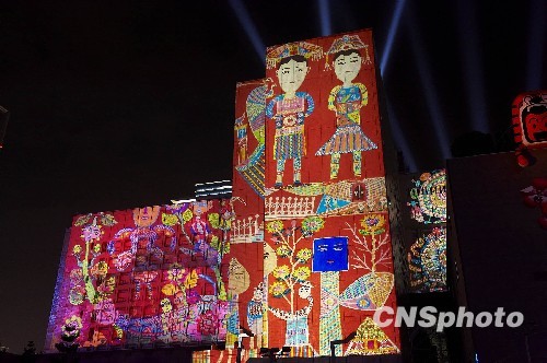 一年一度、聲勢浩大的臺北燈節公共藝術展演27日盛大登場,以“福虎生花三部曲”為主題的燈光秀將在夜間把臺北市府大樓變身成為一個流芳溢彩的大燈籠。圖為三部曲之一的“青春花”。中新社發 閆曉虹 攝