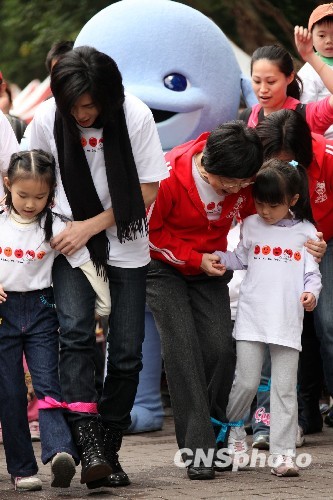 4月4日是臺灣傳統的“兒童節”,全臺各地有眾多親子活動登場,精彩紛呈。圖為當天下午,兒童福利聯盟在臺灣大學舉辦“童心協力”活動,數百家長與孩子們一起進行趣味親子“兩人三腳”健走,臺灣著名歌手蕭敬騰(左二)亦參與其中。中新社發 董會峰 攝