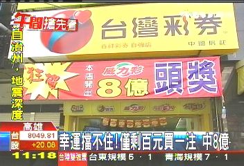 據TVBS報道,財神爺來敲門,真的是擋都擋不住。高雄有一名中年上班族平常都花1千元(新臺幣 下同)買彩券,這一次沒想到他發現身上的1千元不見了,把僅剩的100元拿來買一注威力彩,竟然獨得已經連扛16期的頭彩,彩金8億,是威力彩史上第三高的頭彩。