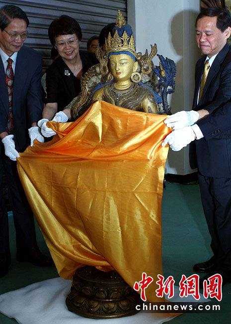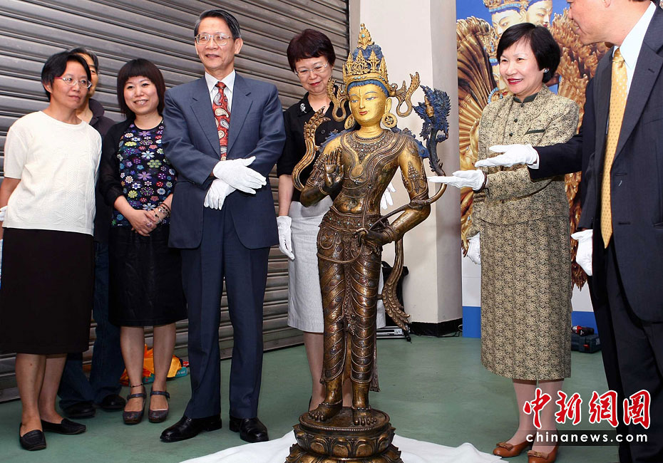 6月25日,工作人員將“鎏金銅彌勒菩薩像”、“金翅白海螺法號(hào)”、“八瓣蓮花曼荼鑼”等3件重量級(jí)文物開(kāi)箱。7月1日,臺(tái)灣故宮博物院將舉辦“圣地西藏---最接近天空的寶藏”特展,展覽分“吐蕃王朝”、“金色寶藏”、“文化交流”、“雪域風(fēng)情”四部分,共有130組件文物參展。中新社記者宋吉河 攝