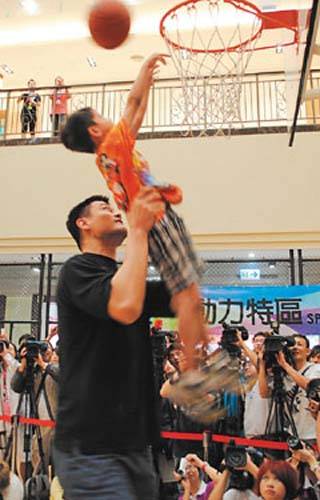 姚明抱起小男生灌籃,全場歡呼聲不斷。圖片來源:臺灣《聯合報》