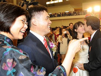 據臺灣“今日新聞網”報道,臺北市政府10日下午舉行“花現臺北2010聯合婚禮”,臺北市長郝龍斌與夫人高閬仙現身為140對新人證婚,并祝福新人“幸福久久、十全十美、雙雙對對、萬年富貴”。