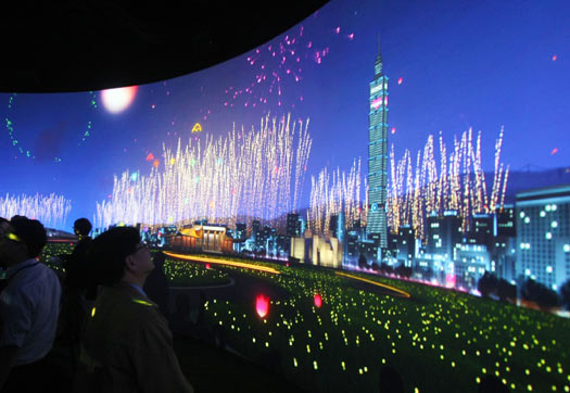 臺北花博夢想館3日舉行開幕儀式,受邀貴賓在環(huán)型劇場前觀看交互式影音動畫。圖片來源:“中央社”