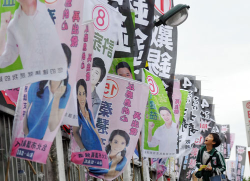 選戰(zhàn)開打,臺(tái)北市天橋上密布市議員競(jìng)選旗幟,放學(xué)路過學(xué)童看得瞠目結(jié)舌。 圖片來源:“中央社”