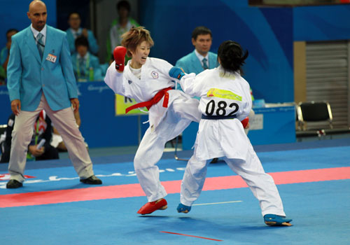 廣州亞運會24日下午進行空手道女子50公斤級銅牌戰,中華臺北隊選手陳彥卉(中)對決韓國選手張昭英(右),雙方使盡全力拼戰,氣氛相當火爆。 圖片來源:“中央社”