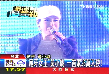 中國(guó)臺(tái)灣網(wǎng)1月9日消息 據(jù)臺(tái)灣TVBS電視臺(tái)報(bào)道,春節(jié)臨近,臺(tái)灣企業(yè)的尾牙活動(dòng)一場(chǎng)接一場(chǎng),藝人們則跟著大撈一筆,誰(shuí)是企業(yè)最愛(ài)的藝人?“滅絕師太”黃小琥以超過(guò)30場(chǎng)封后,堪稱“尾牙女王”。其中,參加日盛金控一場(chǎng)尾牙活動(dòng),她只唱了4首歌就賺了100萬(wàn)(新臺(tái)幣,下同),平均一首歌入賬25萬(wàn),共唱了40分鐘,1分鐘凈賺25000元。