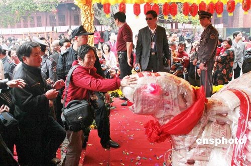 資料圖:二零零八年二月二十二日,福建泉州天后宮舉行熱鬧的傳統民俗“平安乞龜”活動吸引大批市民。十噸袋裝大米制成的“乞龜”長7米,寬近5米,撫摸其頭頂則有平安祝福的美好寓意。 中新社發 傅丹丹 攝