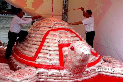 資料圖:二零零七年三月一日,在泉州天后宮廣場內,兩位來自臺灣澎湖縣的“米龜”制作師傅正在為“米龜”做最后的修繕工作。這只“米龜”共由一千兩百袋、六千公斤平安米筑成,屆時,澎湖“乞龜”祈福的民俗表演將首次在泉州展現。 中新社發 傅丹丹 攝