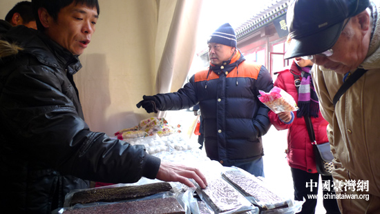 魚丸、茶葉、高粱酒;豆干、年糕、鳳梨酥,除了這些大家耳熟能詳的伴手禮,包括腐乳、XO醬料、米血糕、魚松、肉松等調味品也應有盡有。雖然開街當天北京氣溫仍舊在冰點以下,但設于室外的攤鋪讓市民們找到了一種舊時“辦年貨”的味道。