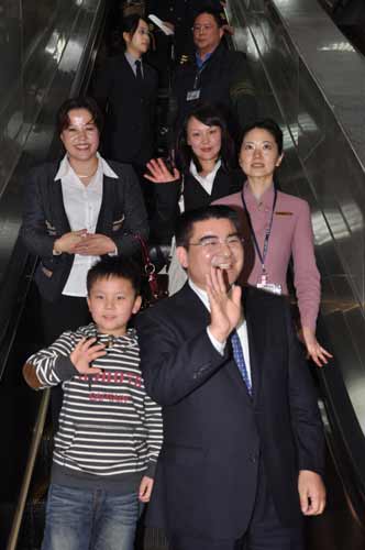 大陸企業家陳光標(右)26日晚間率團搭機抵臺,他的妻子(左)及兒子(中)也同行。 圖片來源:“中央社”