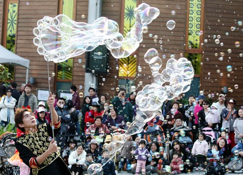 夢想小丑劇團(tuán)22日在臺北花博會新生園區(qū)的夢想庭園,演出“歡樂魔法泡泡秀”,讓參觀民眾體驗泡泡的造型之美。