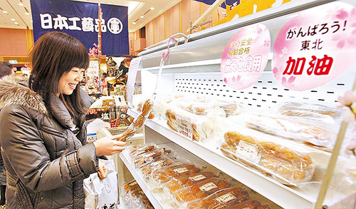 臺灣太平洋SOGO百貨忠孝館表示,貨品是地震前進口,多樣商品熱銷,包括北海道鮭魚片、宮城柿餅、烏龍面每天賣出200份,青森蘋果脆片原準備13天檔期備貨量,4天就售完。