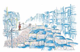 《在這個(gè)世界里的自我角落》,畫的是一名在電線桿上騎車的人,就算行為怪異也有屬于自己的生活方式 。這幅畫作在臺(tái)北完成。