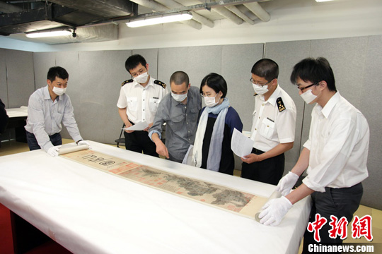 5月18日,北京海關快速驗放赴臺北故宮博物院《山水合璧—黃公望與富春山居圖特展》參展的12件珍貴文物。 中新社發 雷虹 攝
