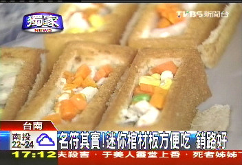 據臺灣TVBS電視臺報道,臺南知名小吃“棺材板”猶如厚片土司般大小,吃多了會膩,日前有業者將它改良成“迷你版”,只有1/3大小,從方型變成長條型,外觀果然更像棺材,里頭加的餡料,也去除“下水”,換上雞肉及杏鮑菇,可以拿著邊走邊吃,生意果然比大的還要好。