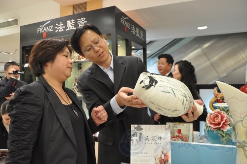 據介紹,臺灣法藍瓷與臺北故宮博物院合作,取得正式授權,以館藏經典畫作為藍本,法藍瓷華東區吳經理也與現場來賓介紹清朝宮廷畫家郎世寧的“虞美人與蝴蝶花”、臺北故宮人氣典藏“翠玉白菜”、文人皇帝宋徽宗名作“蠟梅山禽圖”等。臺北故宮博物院以豐富典藏聞名全球,典藏總數超過65萬件,其中許多皆為皇家典藏藝品。